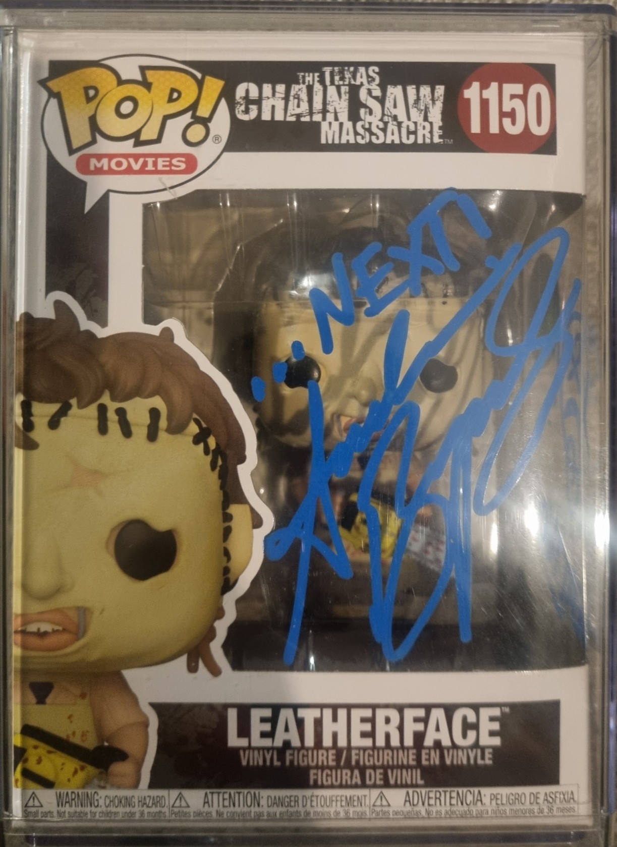 #1150 Pop Movies The Texas Chainsaw Massacre Leatherface Signed in Blue Pen – For The Love Of Horror @ Bowlers Exhibition Centre