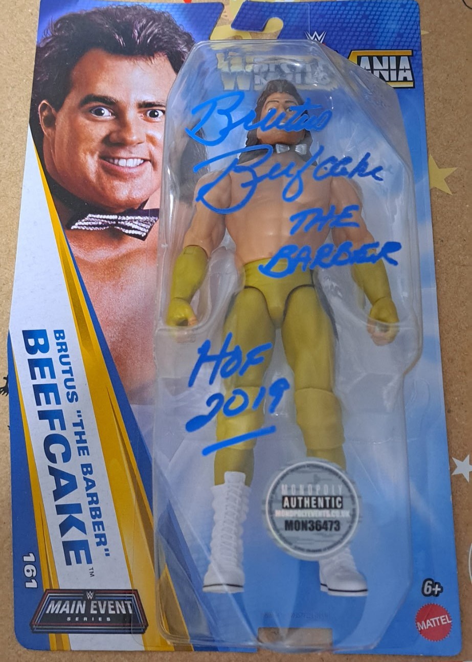 Mattel WWE Main Event Series 161 Brutus “The Barber” Beefcake action figure Signed in Blue Pen – For The Love of Wrestling @ BEC Arena Manchester