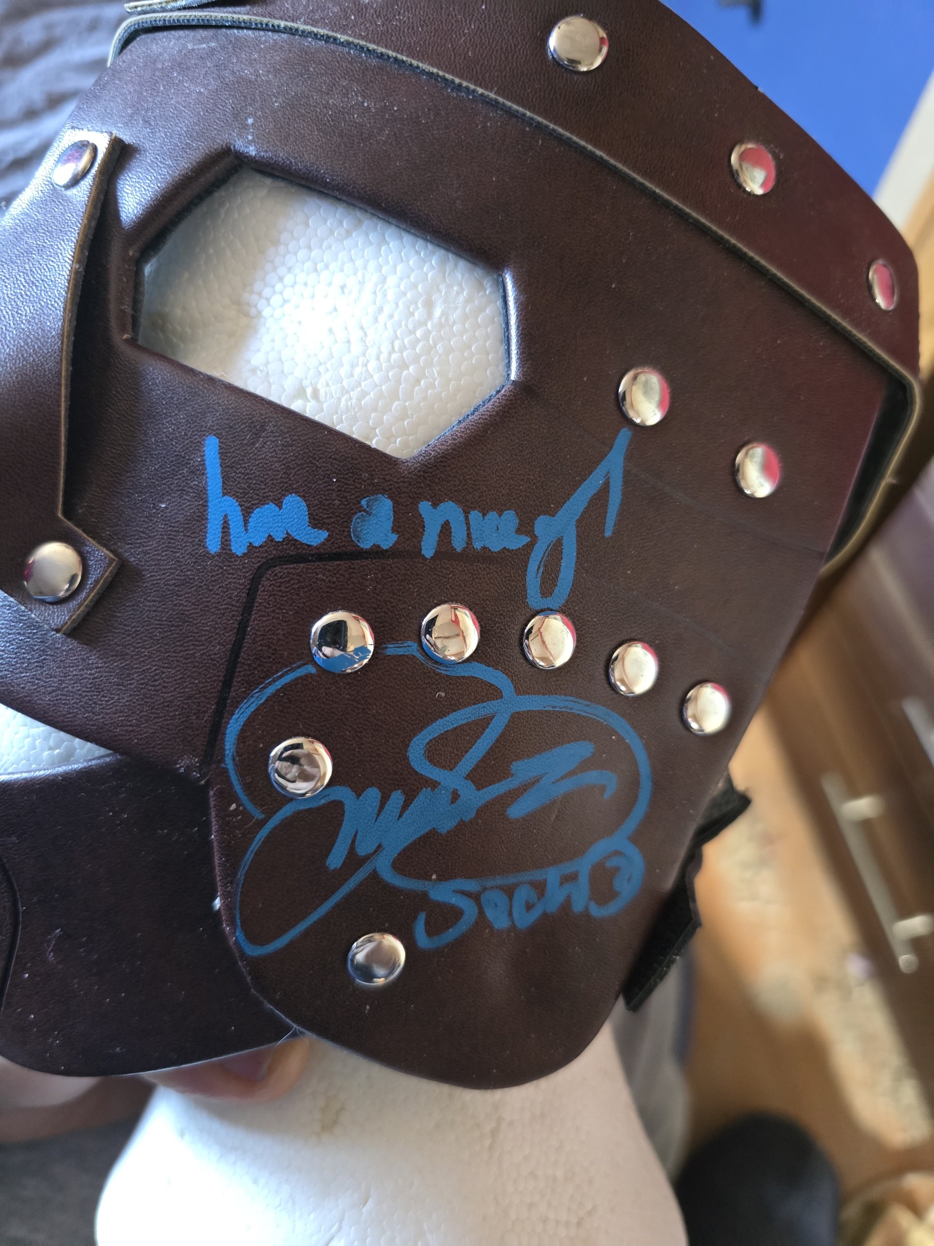 Leather Mask Signed in Blue Pen – For The Love of Wrestling @ Bowlers Exhibition Centre