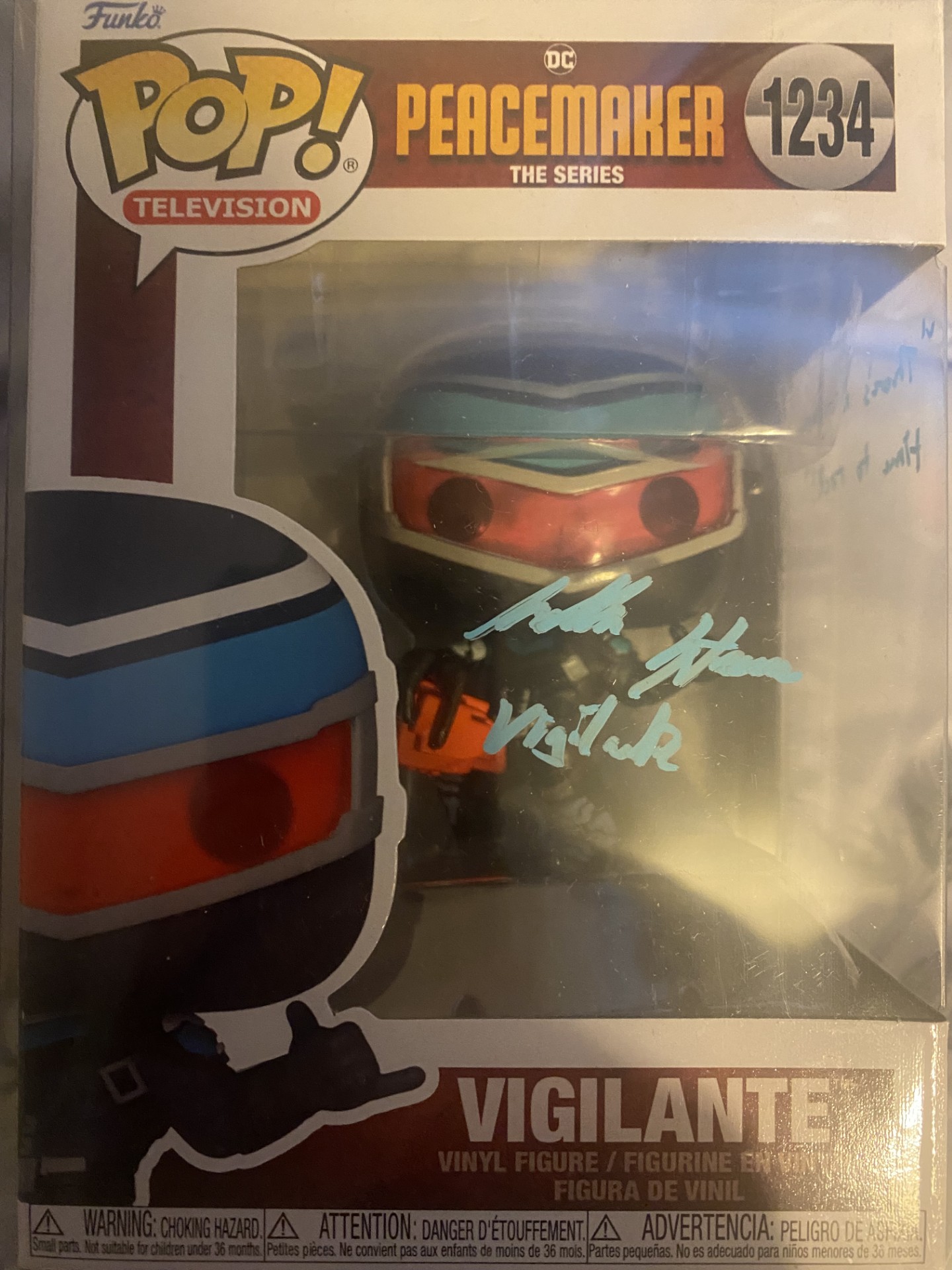 #1234 Pop Television Peacemaker Vigilante Signed in Blue Pen – Comic Con Liverpool @ Exhibition Centre Liverpool
