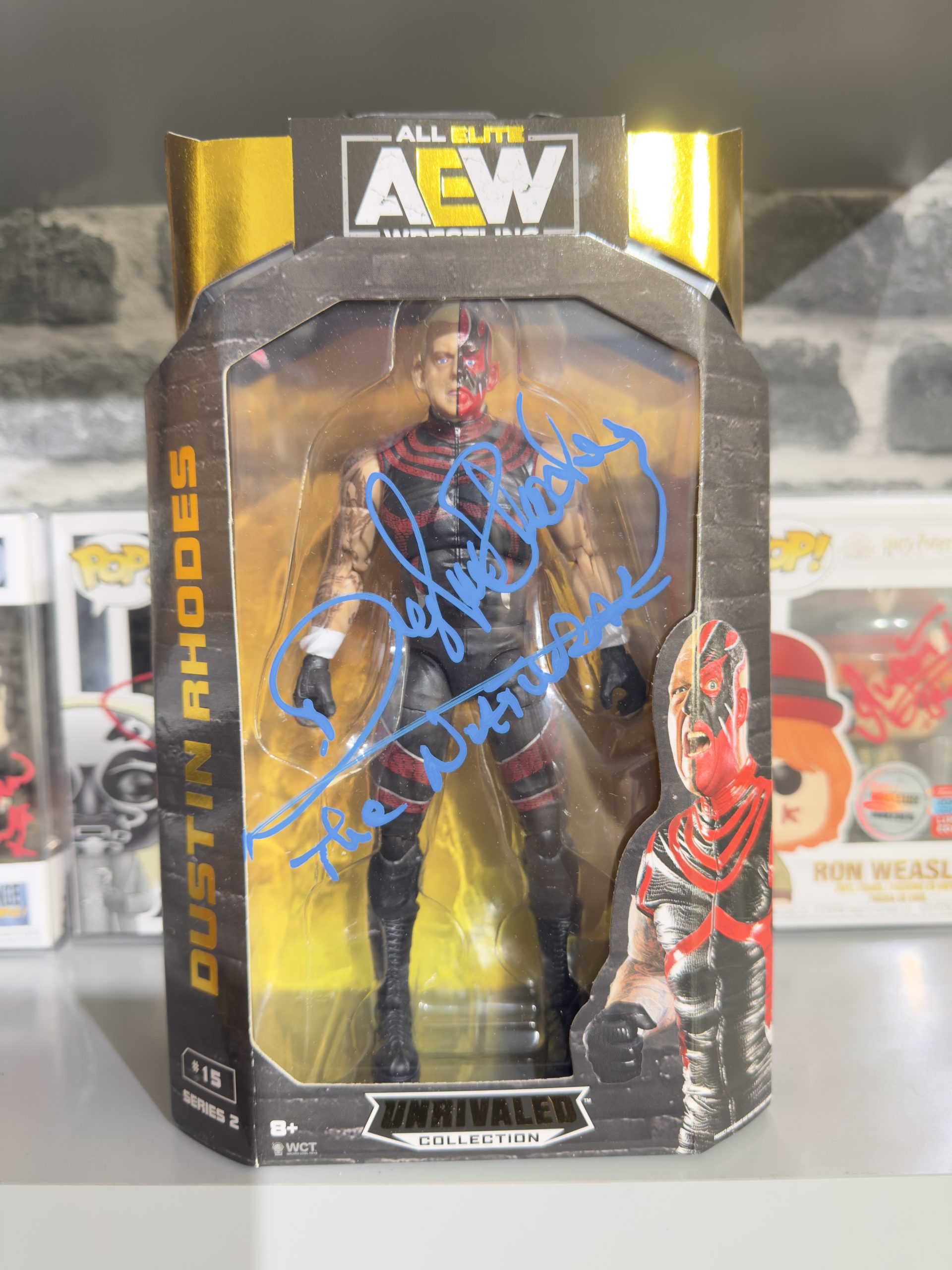 AEW Unrivaled Collection Dustin Rhodes action figure Signed in Blue Pen – For The Love of Wrestling @ BEC Arena Manchester