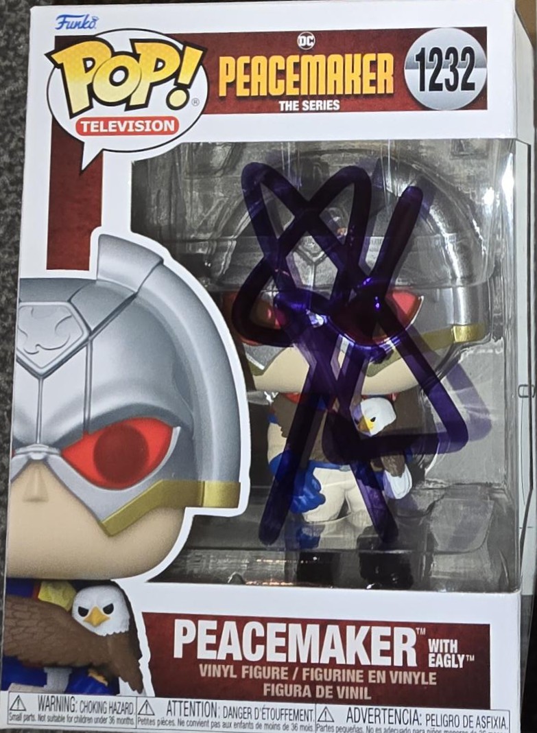 #1232 Pop Television DC Peacemaker The Series Peacemaker With Eagly Signed in Blue Pen – Comic Con Liverpool @ Exhibition Centre Liverpool