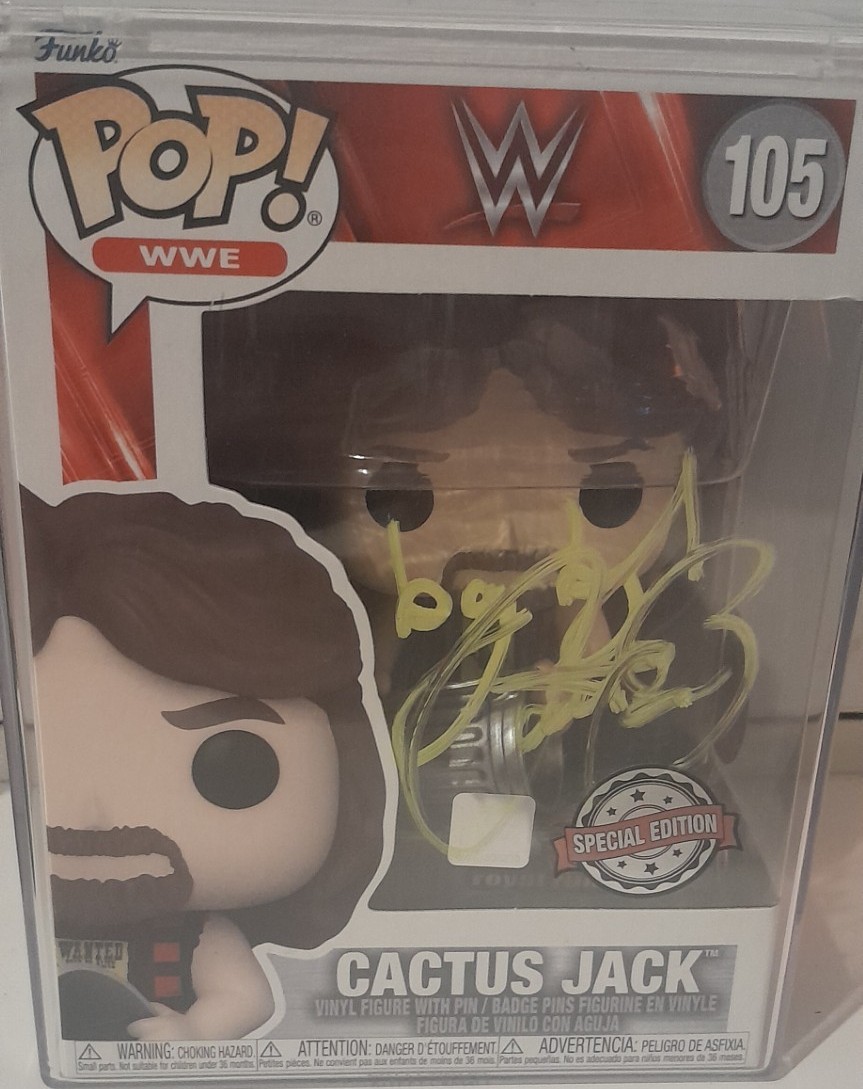 #105 Pop WWE Cactus Jack Signed in Yellow Pen – For The Love of Wrestling @ Bowlers Exhibition Centre