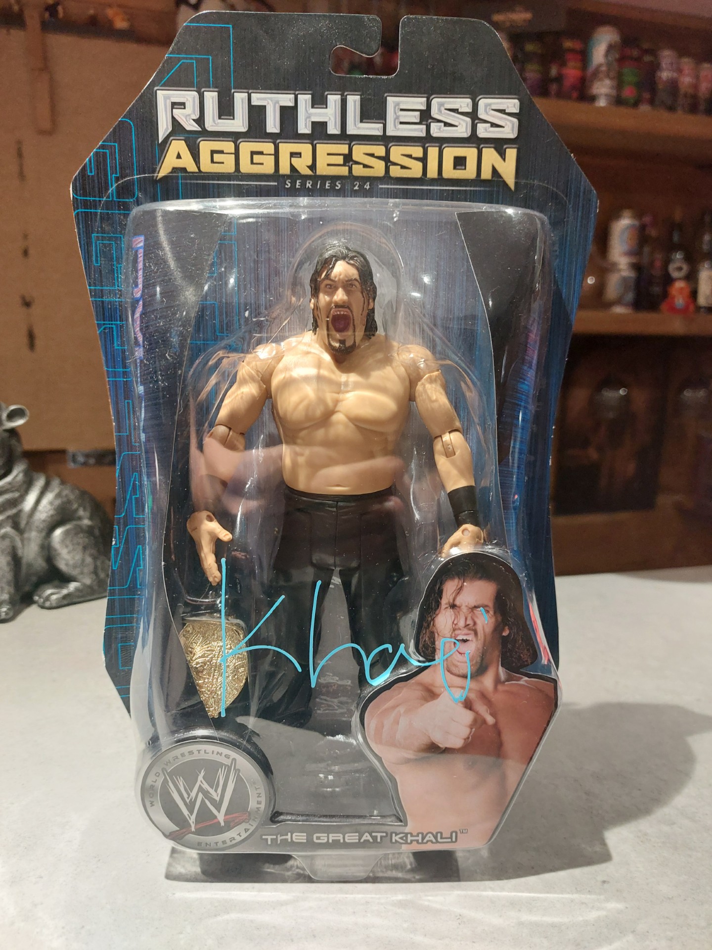 Jakks Pacific WWE Ruthless Aggression Series 24 The Great Khali action figure Signed in Blue pen – For The Love of Wrestling @ BEC Arena Manchester